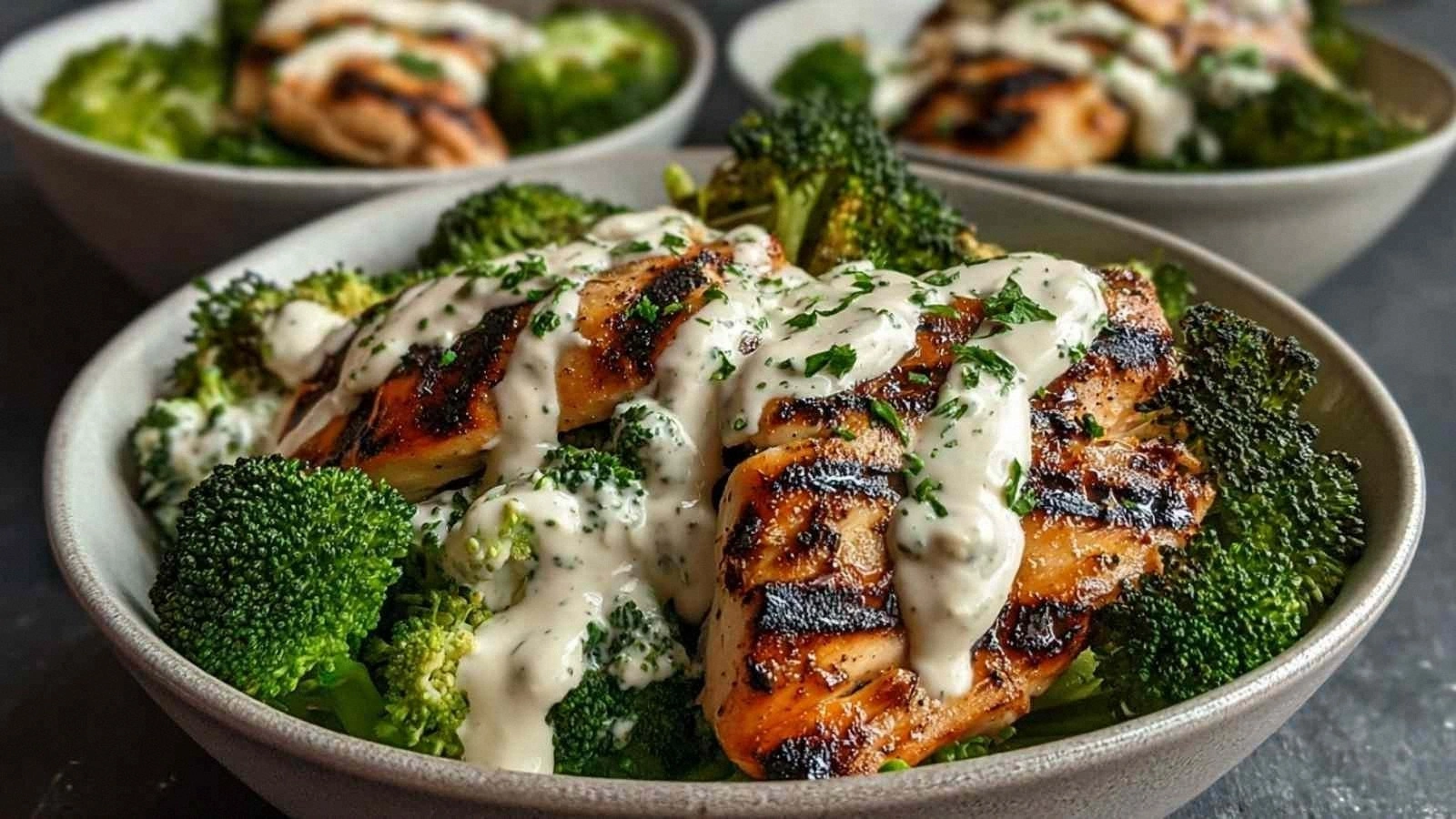 - Arrange the warm grains in a bowl as the base. Layer the grilled chicken on top, then scatter the blanched broccoli around. Drizzle the creamy sauce over the entire bowl, making sure each component gets a generous coating.